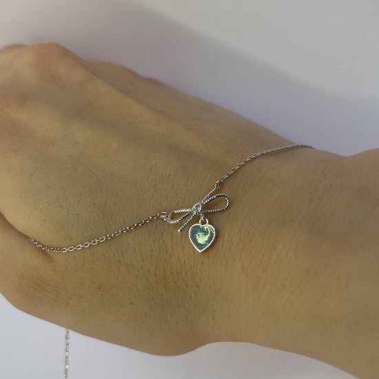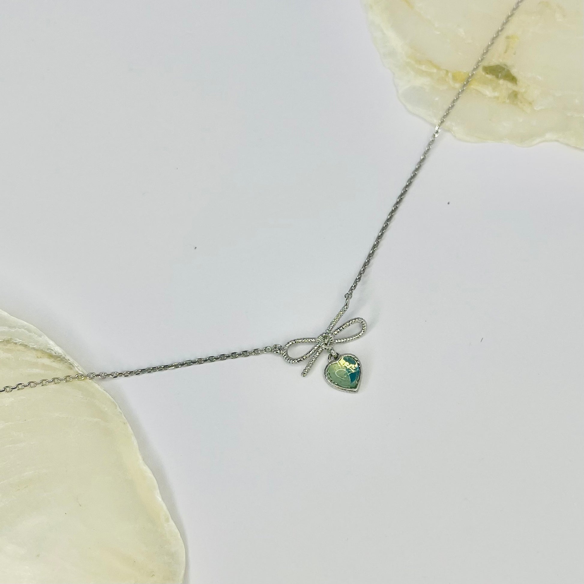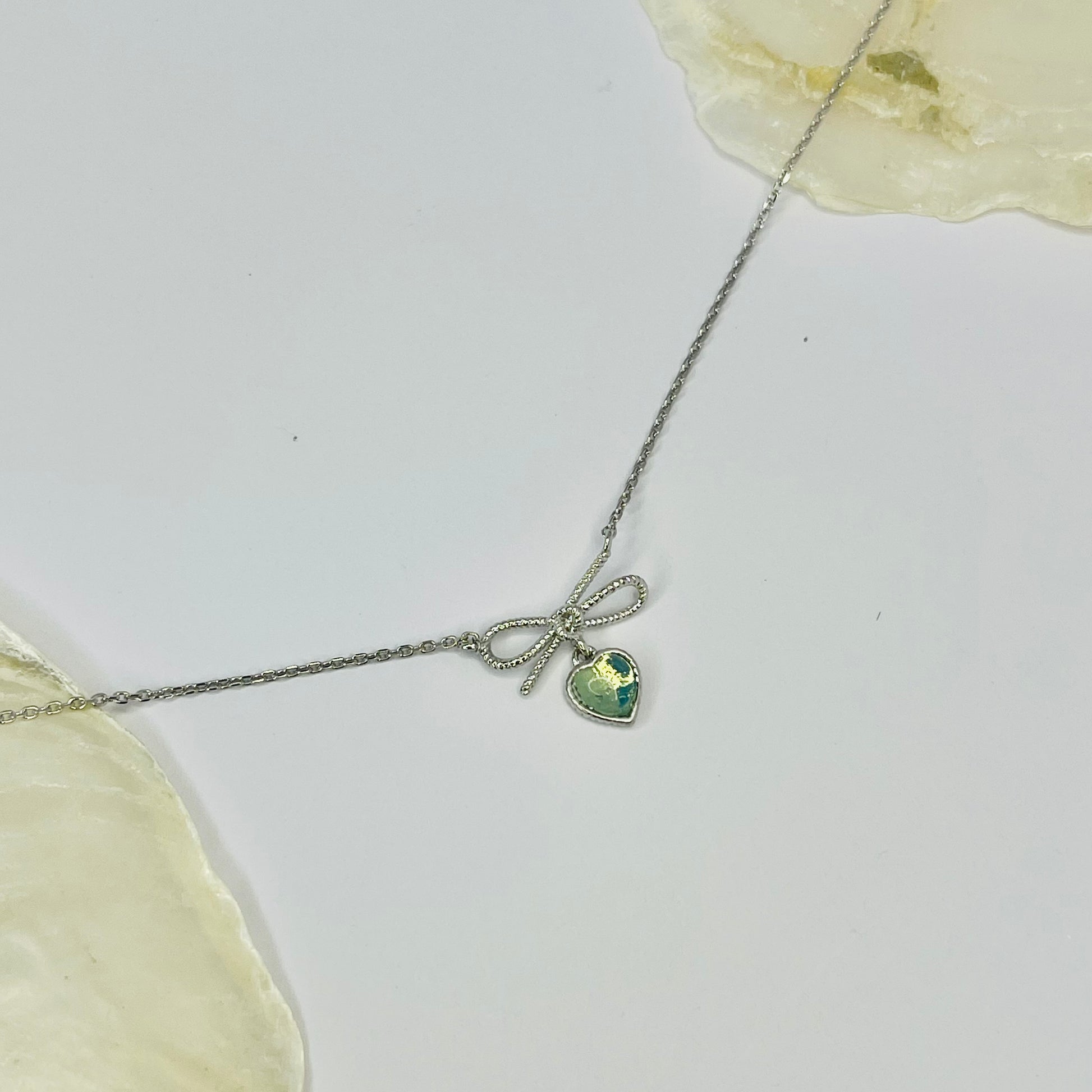 Zarte Eleganz trifft auf Romantik: Diese wundervolle Halskette besticht durch ein mintgrünes Herz, das von einer feinen Schleife zart umrahmt wird. Das sanfte Farbspiel verleiht jedem Outfit einen Hauch von Magie und Weiblichkeit. Perfekt für alle, die subtile Schönheit und zeitlose Designs lieben – ein Schmuckstück, das Ihre Persönlichkeit auf charmante Weise unterstreicht und zu Ihrem treuen Begleiter wird.