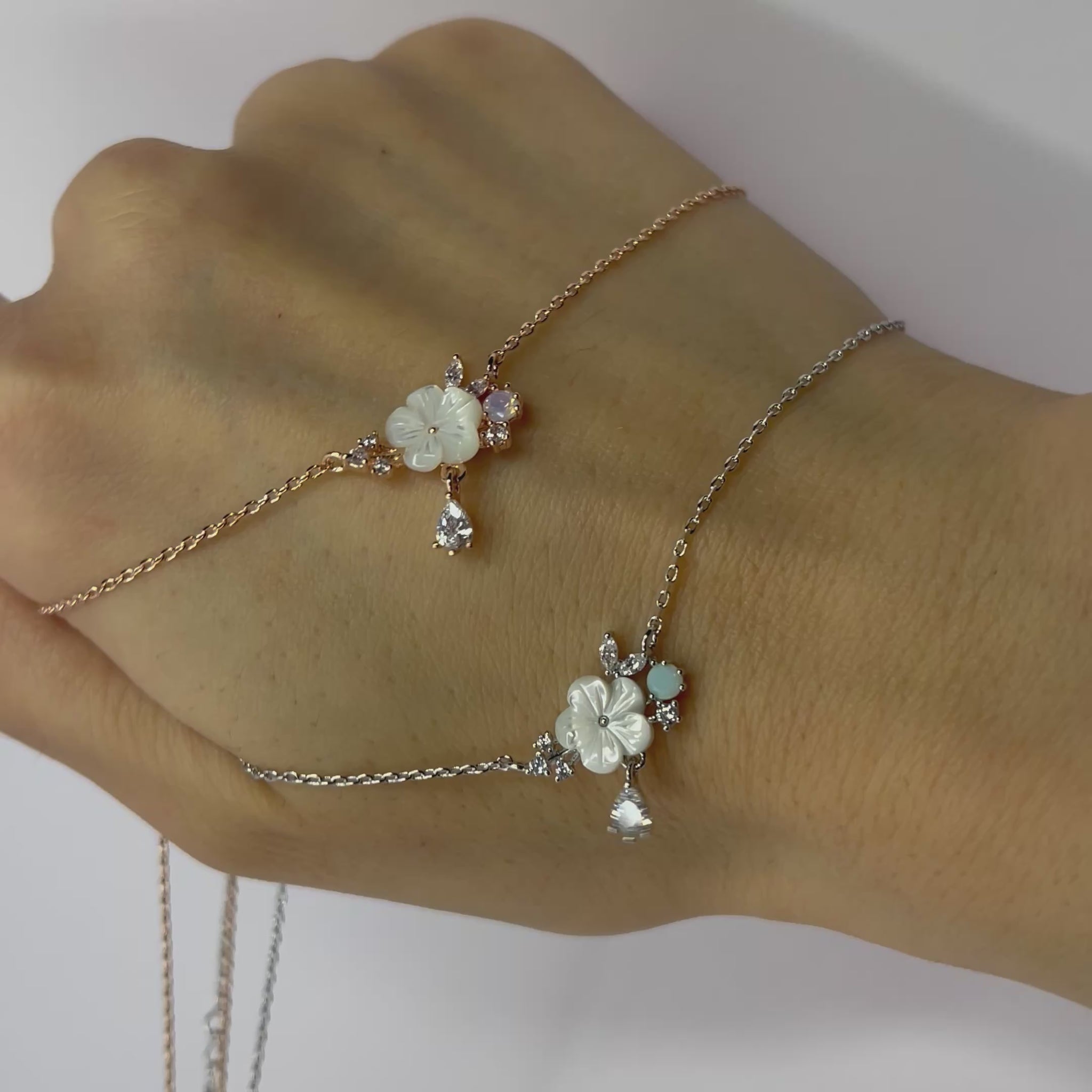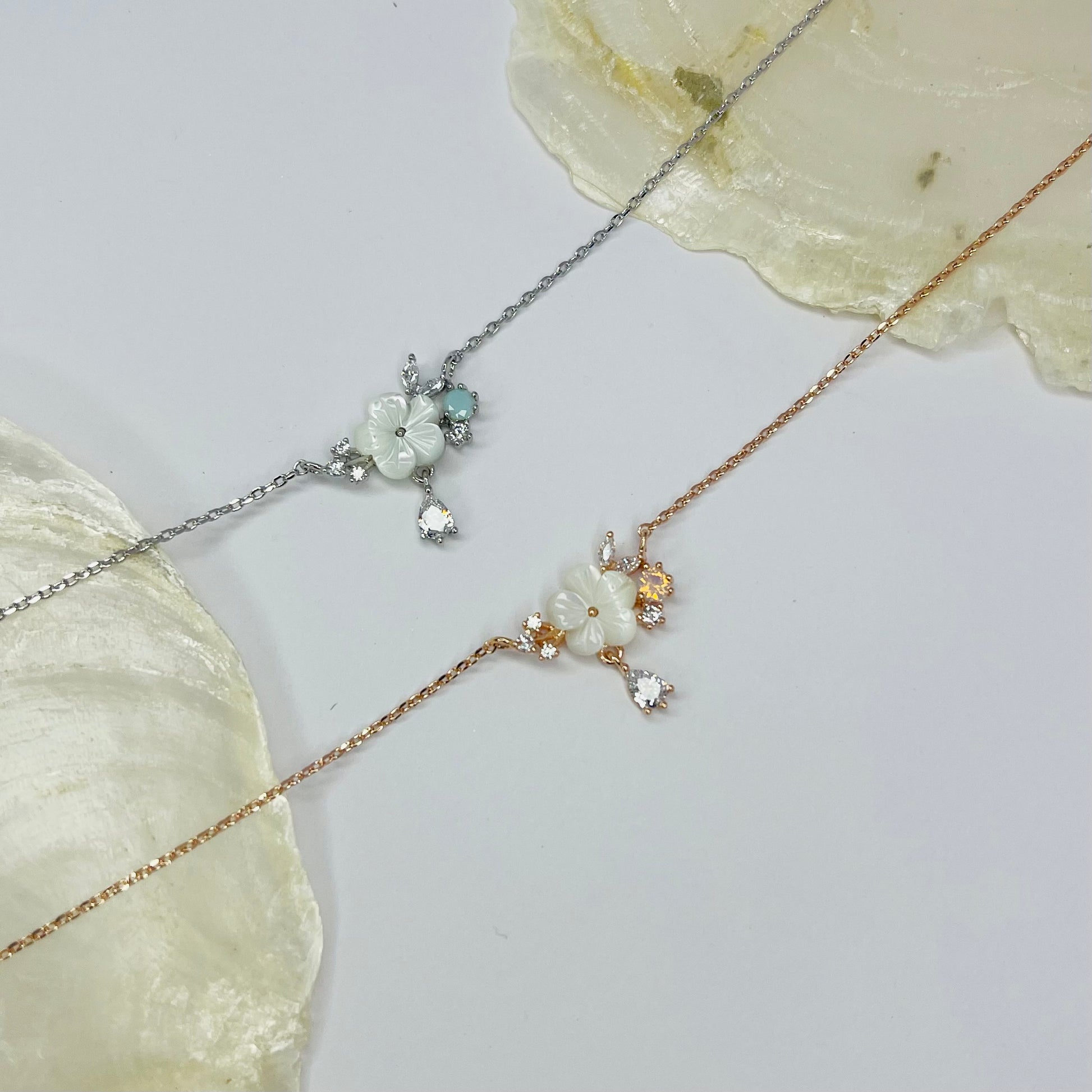 Elegante Halskette mit tropfenförmigem Anhänger, der weiße Blüten in zartem Glanz präsentiert. Das feine Schimmer-Finish fängt das Licht wunderbar ein und verleiht jedem Outfit einen Hauch von Romantik und Raffinesse. Ein zeitloses Schmuckstück, das dich bei jedem Anlass strahlend aussehen lässt.